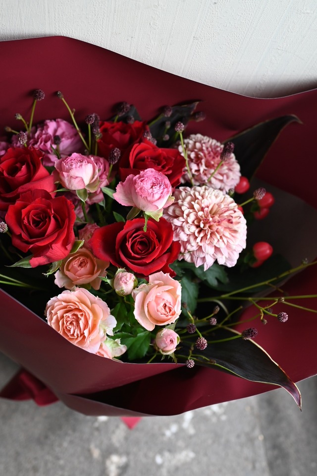 赤系のバラをメインにニュアンスカラーのお花を入れて、シックな雰囲気のあるブーケに仕上げました。 ✽花材は、イメージです。仕入れ状況に応じて少し変更することがあります。