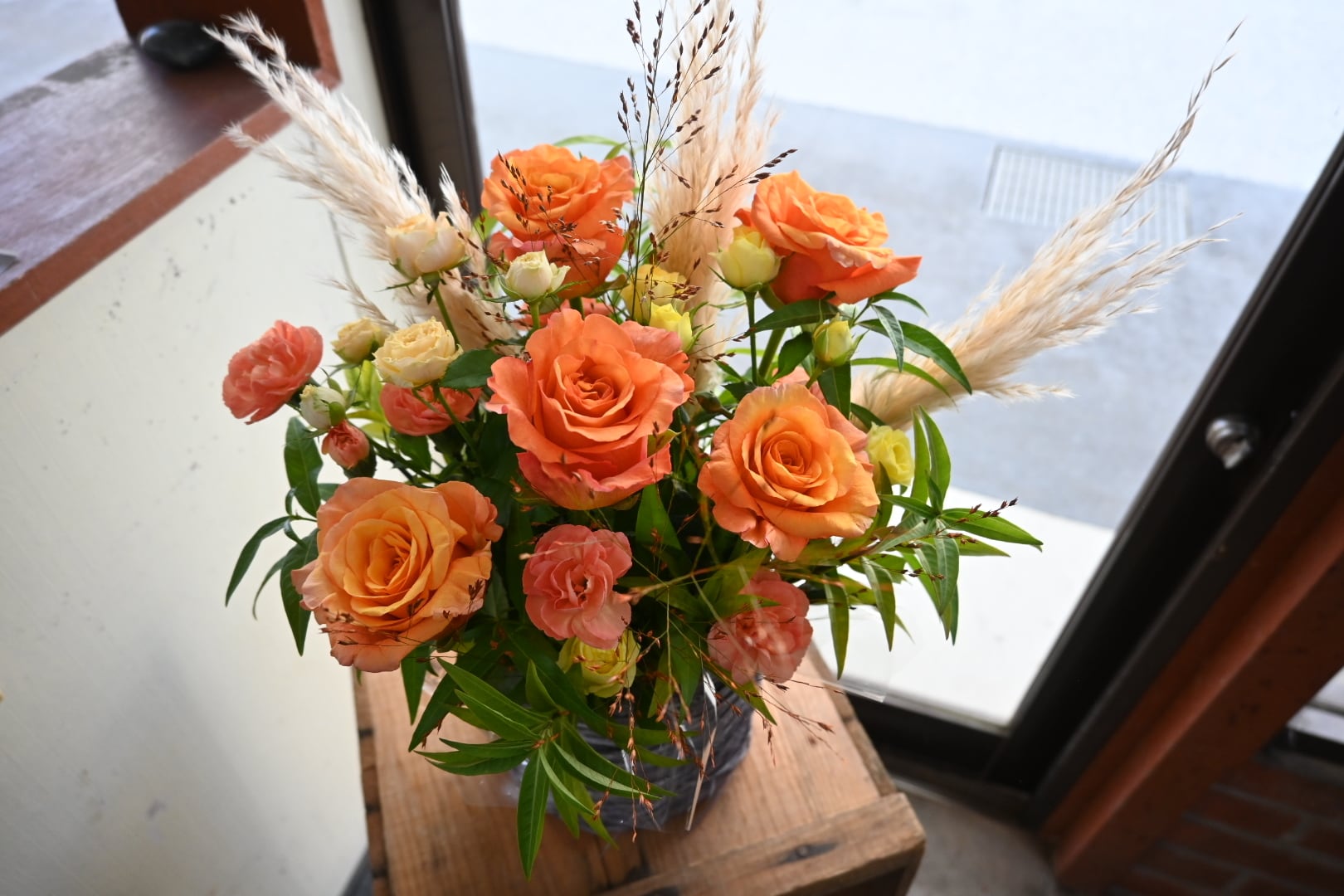 オレンジのバラにパンパスグラスなどを合わせて、秋の雰囲気にまとめました。
