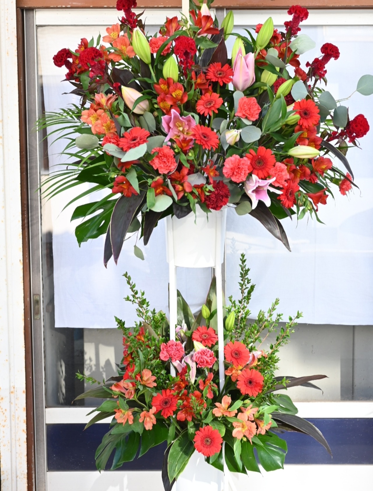赤系のスタンド花2段