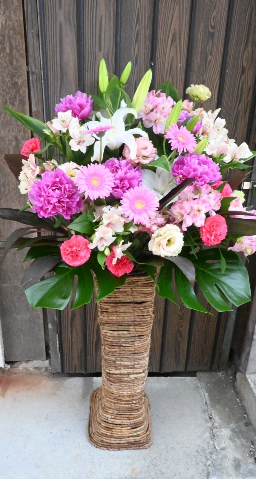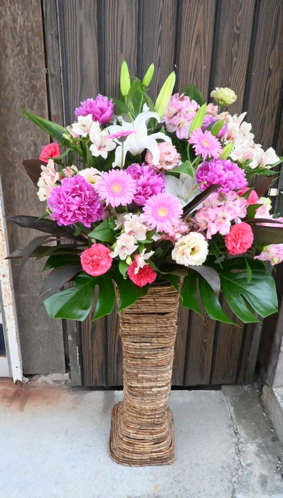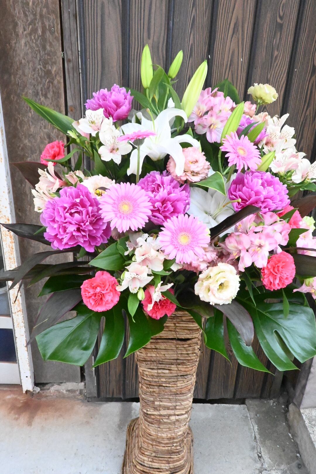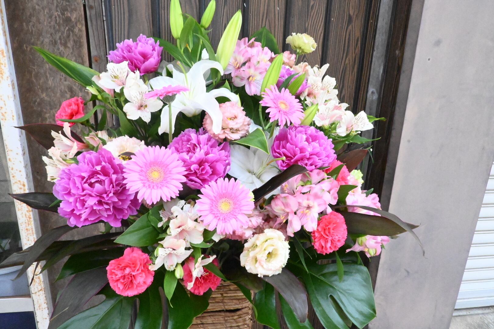 一般的なスタンド花と比べると、少し高さが低いですが、ナチュラルなかごの雰囲気で、和風の古民家から洋風のレストランへのお届けなど、いろいろなシチュエーションによく合います。