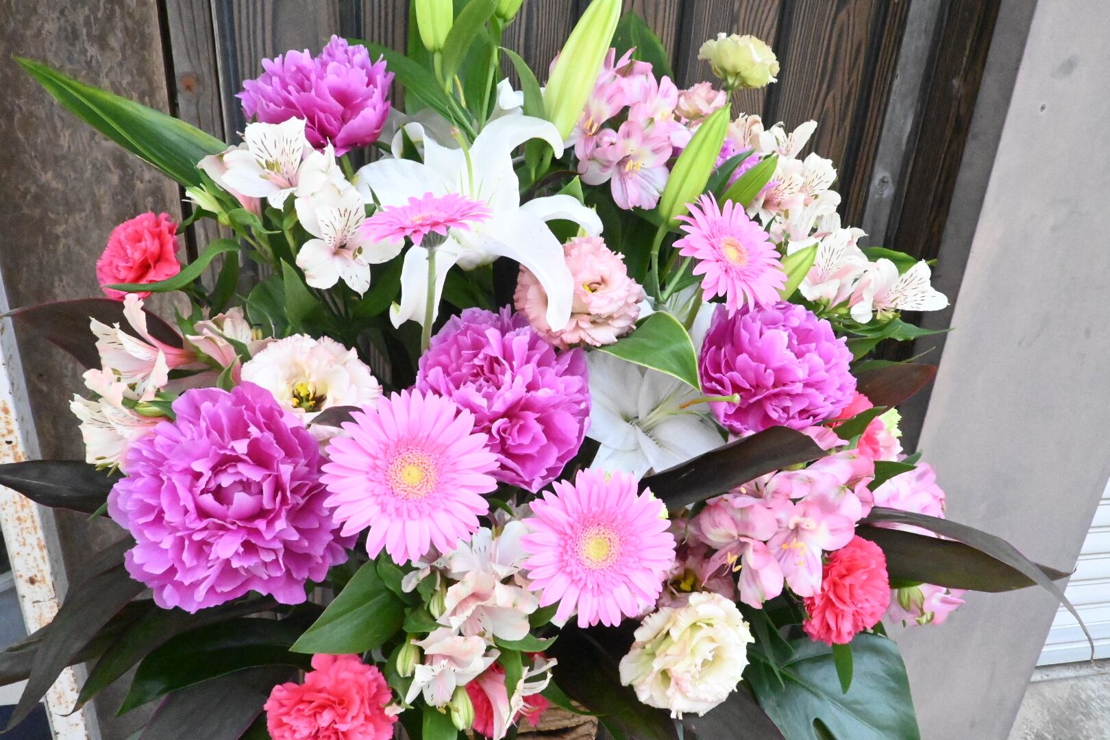 こちらは、ピンク系の色合いでご用意した季節のスタンド花です。