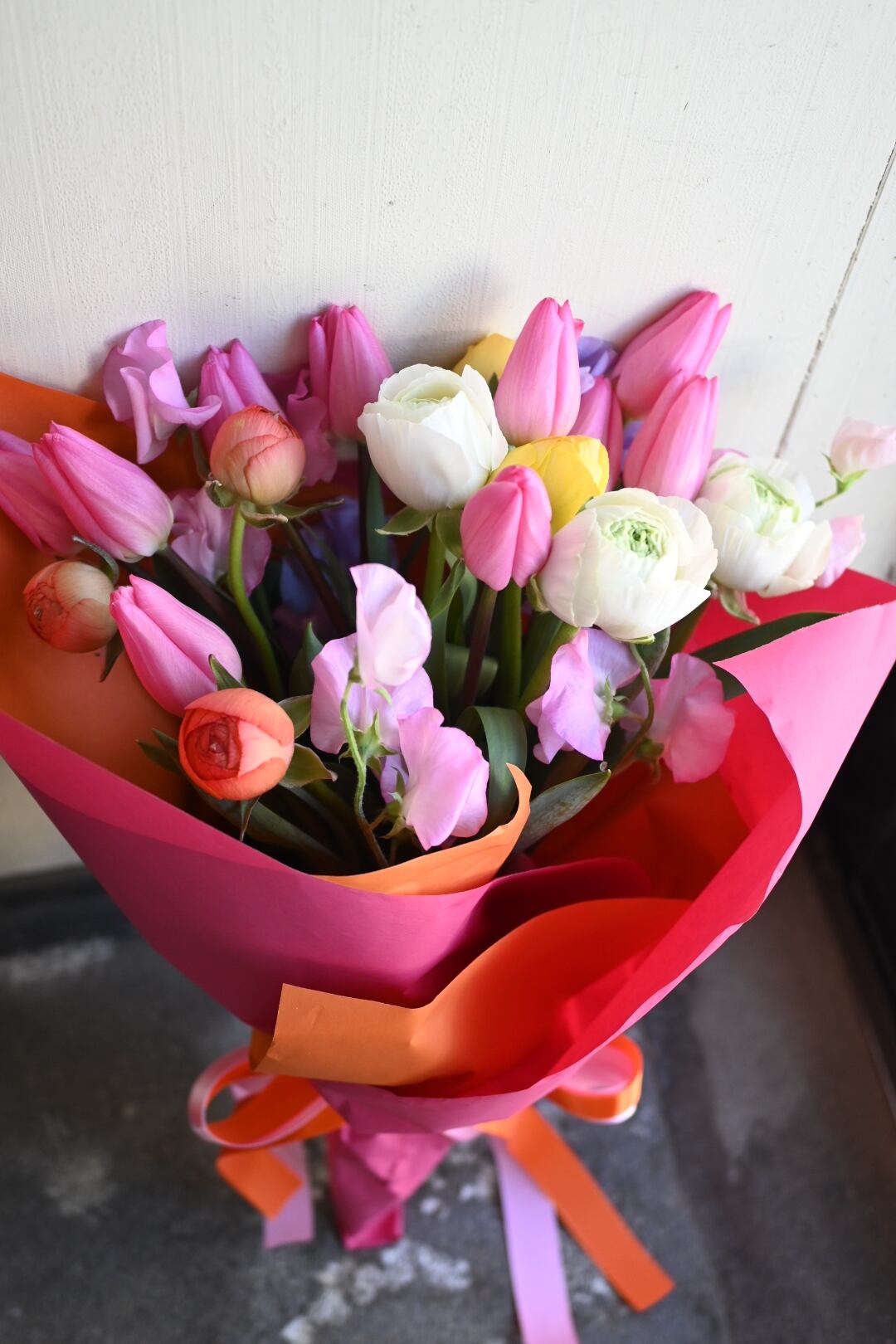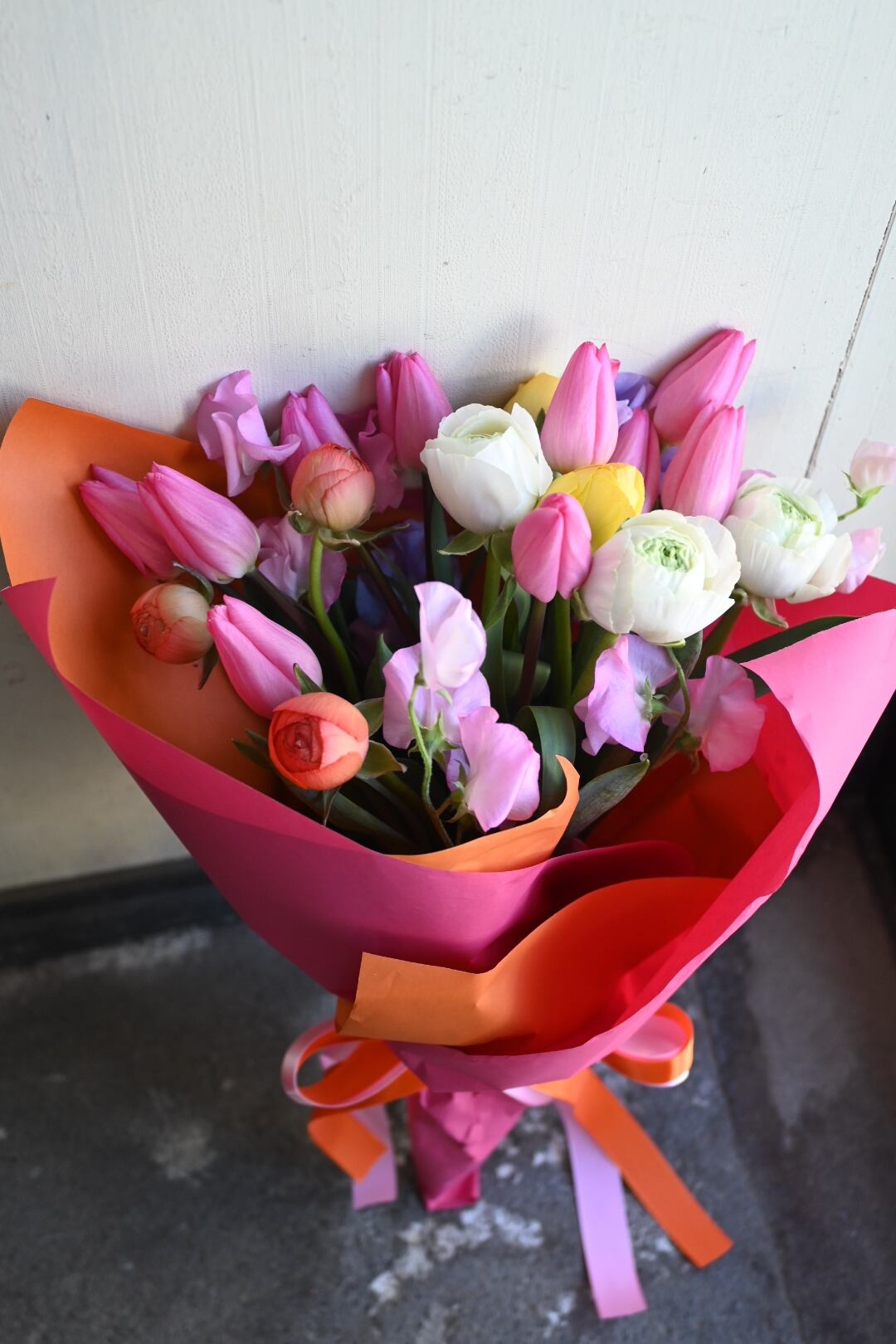 色とりどりのチューリップ、ラナンキュラス、スイトピーをポップな色合いで包んだブーケです。