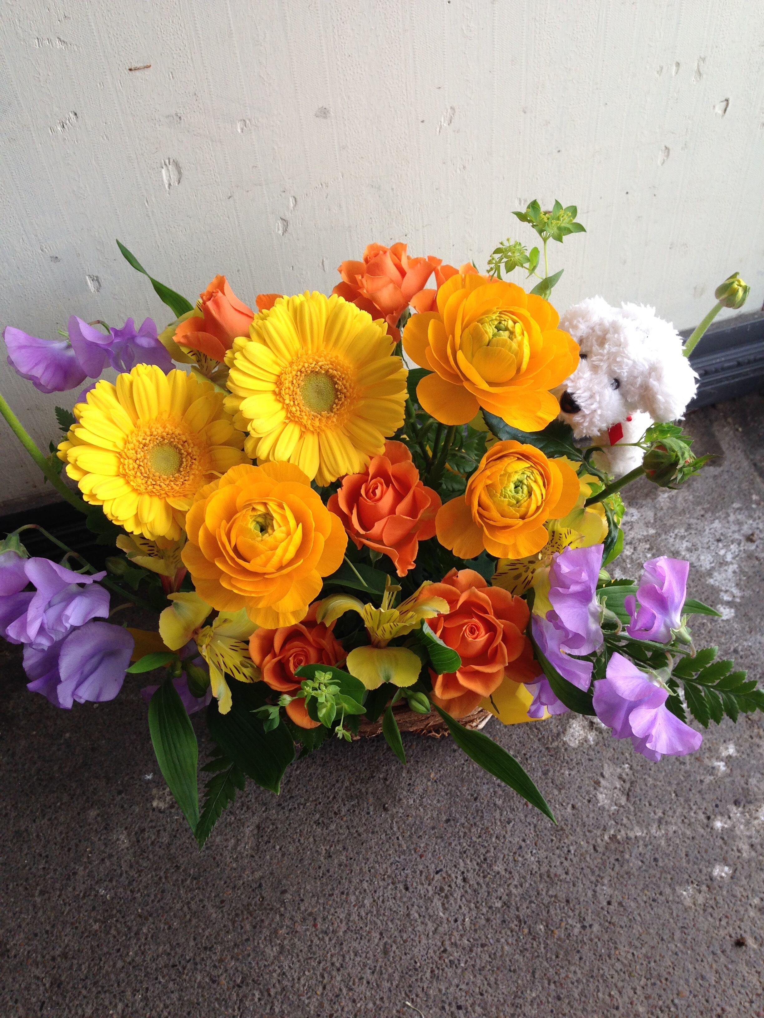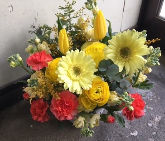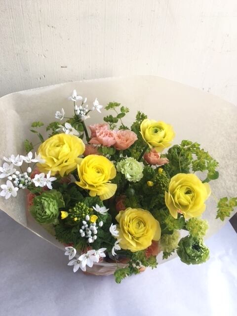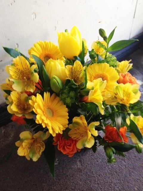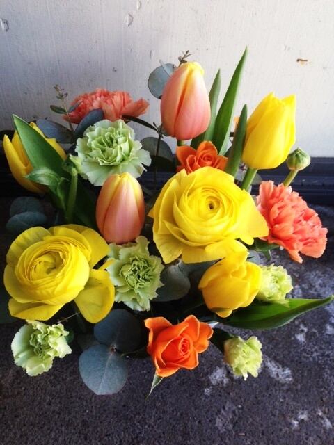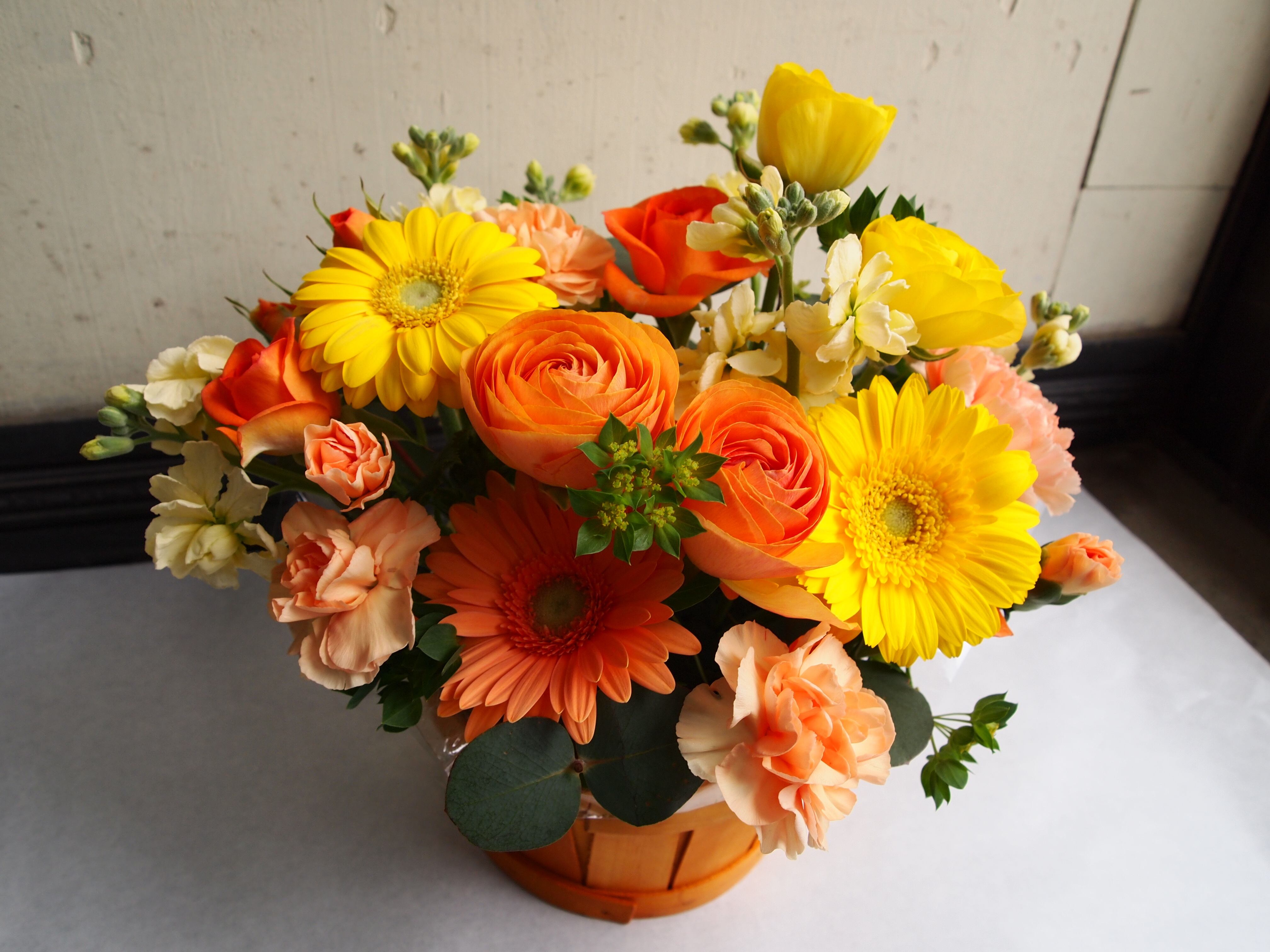 季節のおすすめのお花をいれて、イエロー・オレンジ系でおつくりします。