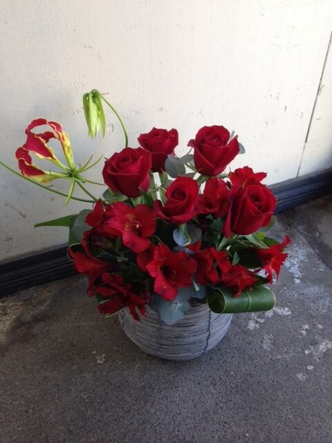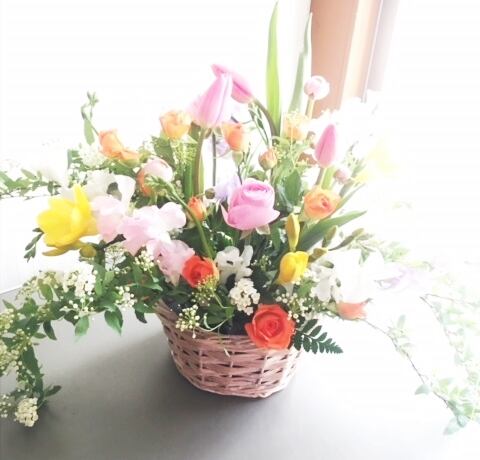 写真は、過去のお届け例です。入荷状況やかごの在庫状況に合わせて、ベストなお花でお届けします。