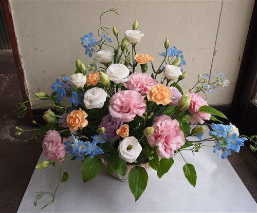 ピンクのトルコキキョウにさわやかなブルーやオレンジを合わせたアレンジです。