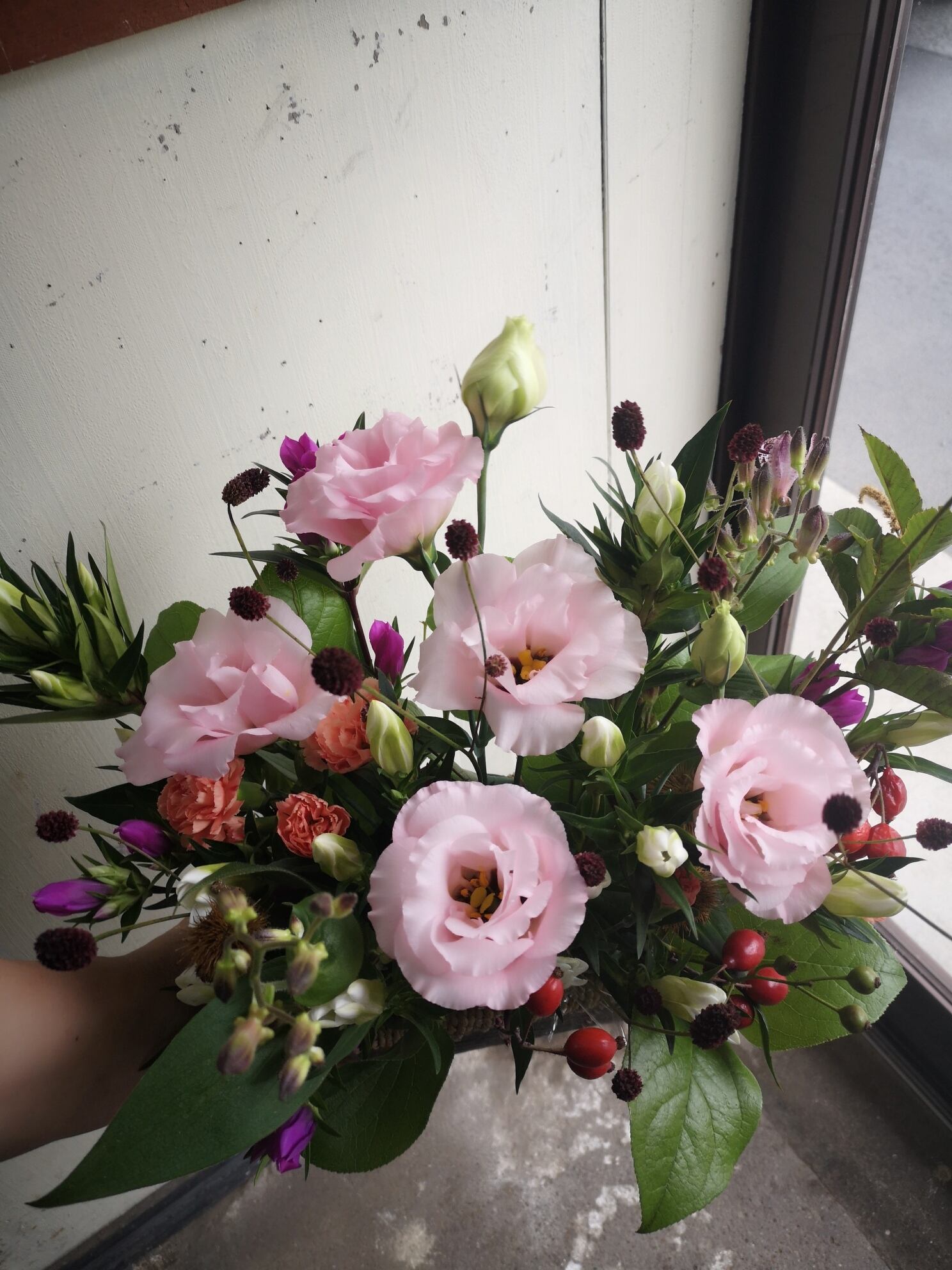 ピンクのトルコキキョウに、われもこうや赤の実ものなどを合わせて、ナチュラルな雰囲気で作ります。