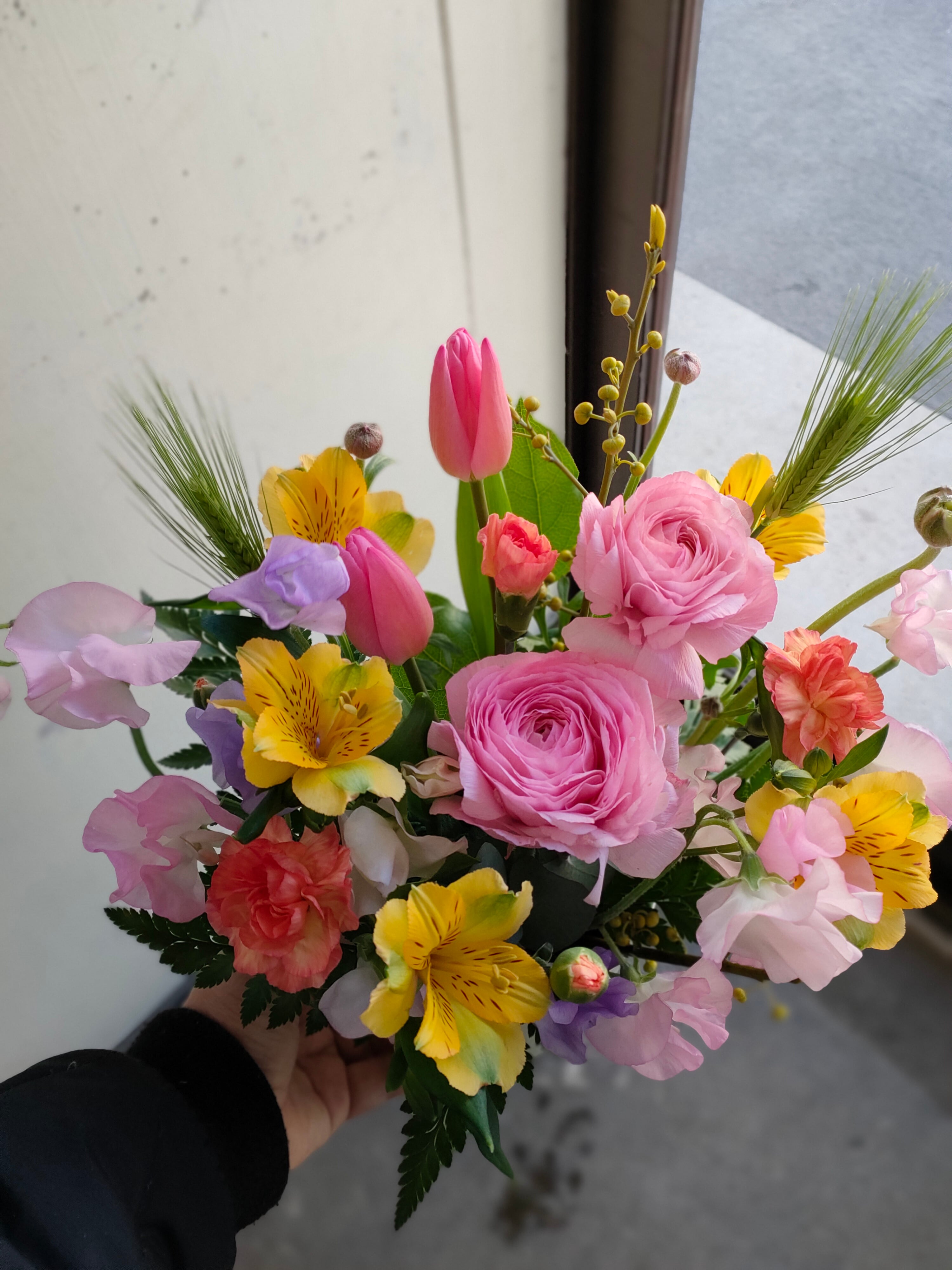 チューリップ、ラナンキュラスにイエローのアルストロメリアを入れたアレンジです。