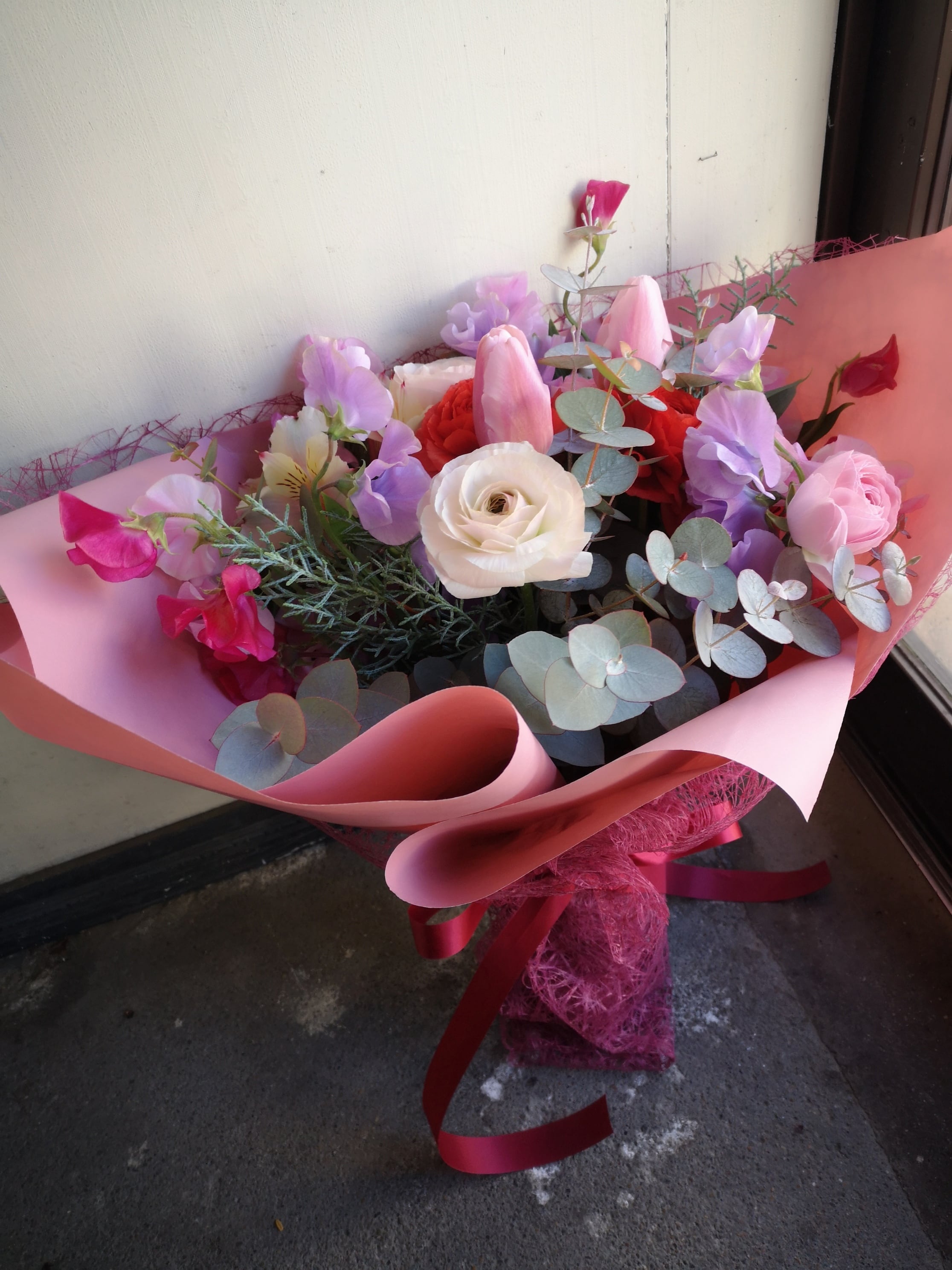 チューリップやラナンキュラス、スイトピーなどの春のお花を使い、ピンク・パープル系の色合いでまとめました。