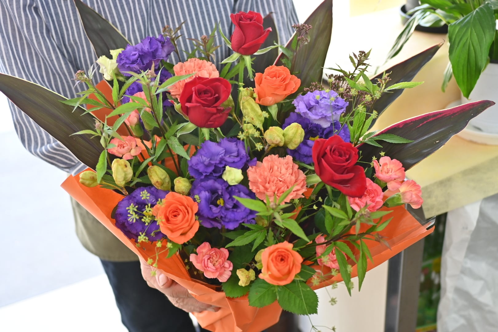 赤・オレンジ系のお花に、落ち着いた紫のお花を合わせ、秋の草花などをいれて、秋の豊かさを表したアレンジです。