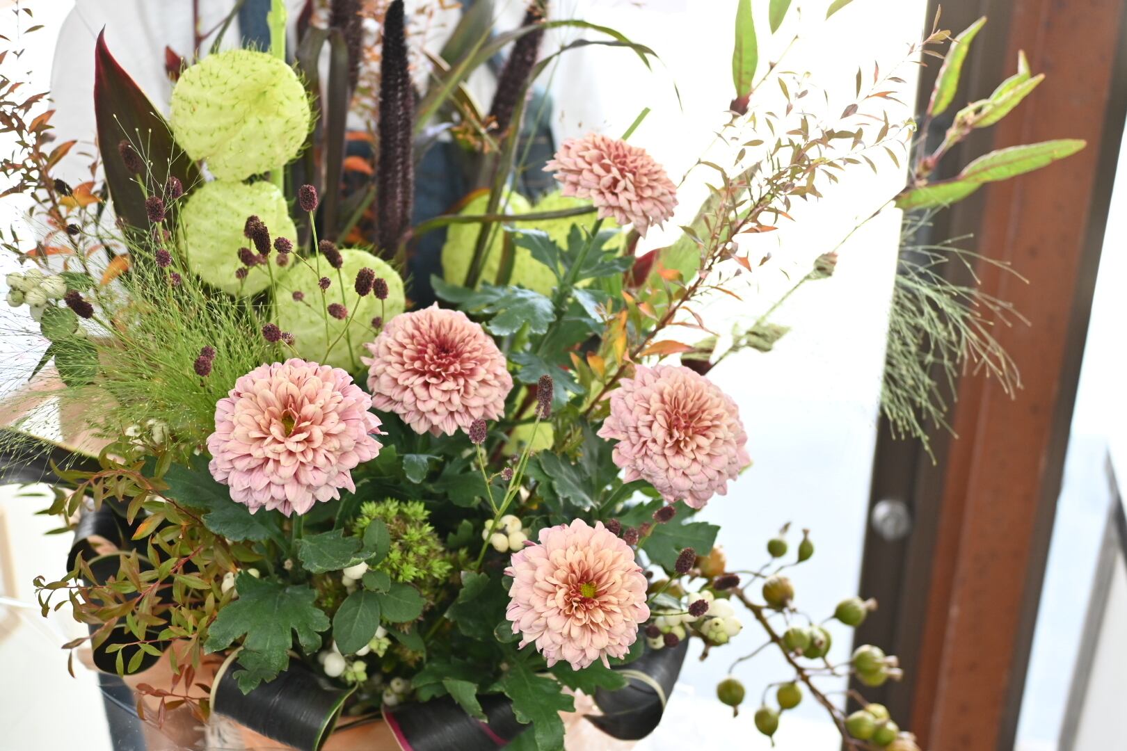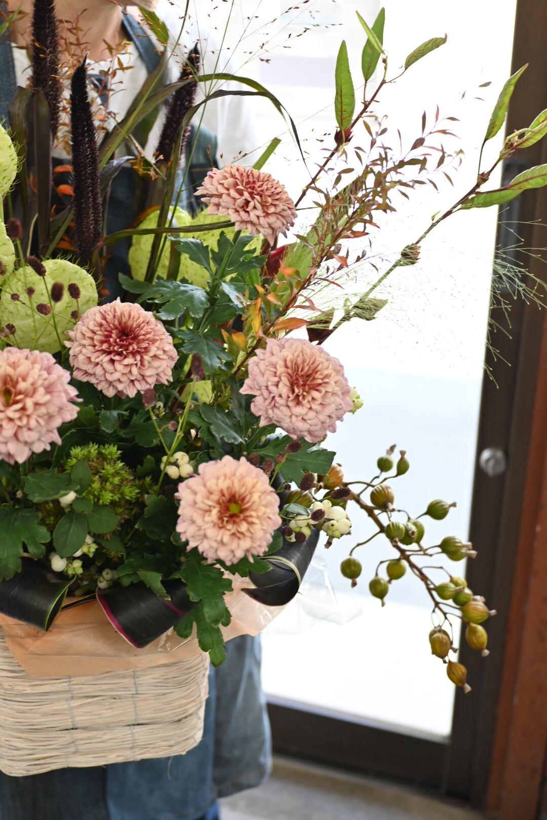 秋らしい草花や枝もの、実物などを入れた雰囲気のあるアレンジです。