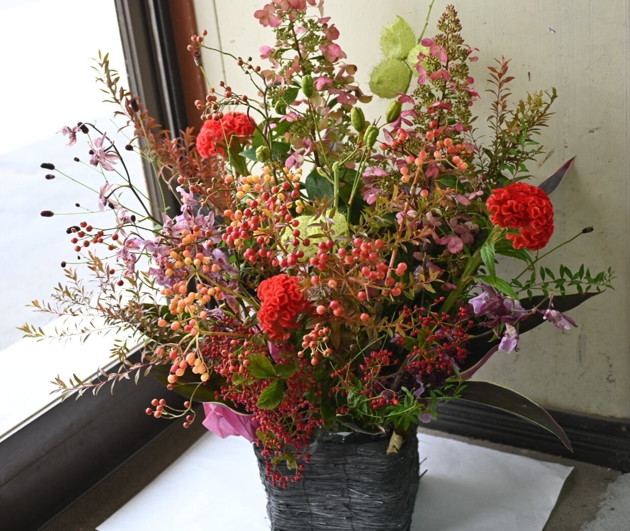 秋色の紫陽花やワレモコウに、いろいろな実物を合わせて、上品な季節のアレンジに仕上げました。