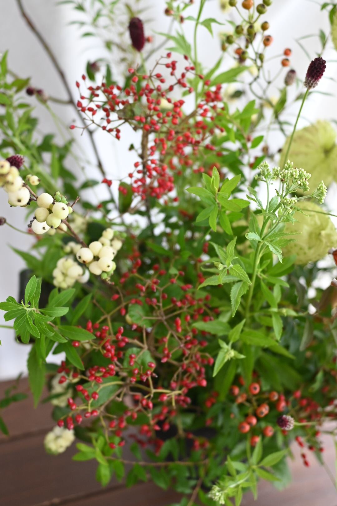 野バラの実や雪柳、ワレモコウにいろいろな実ものを合わせて、ナチュラルな雰囲気に。