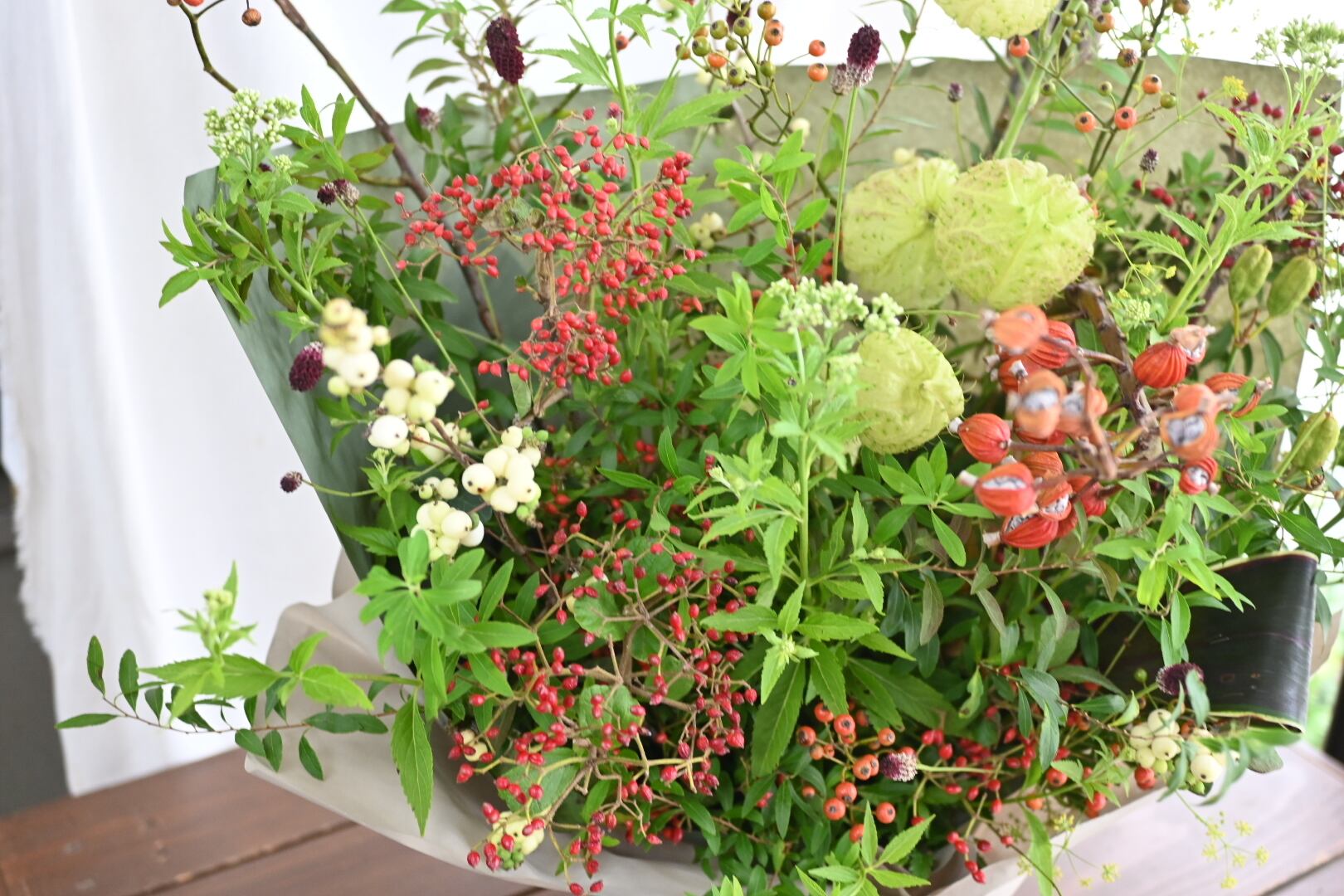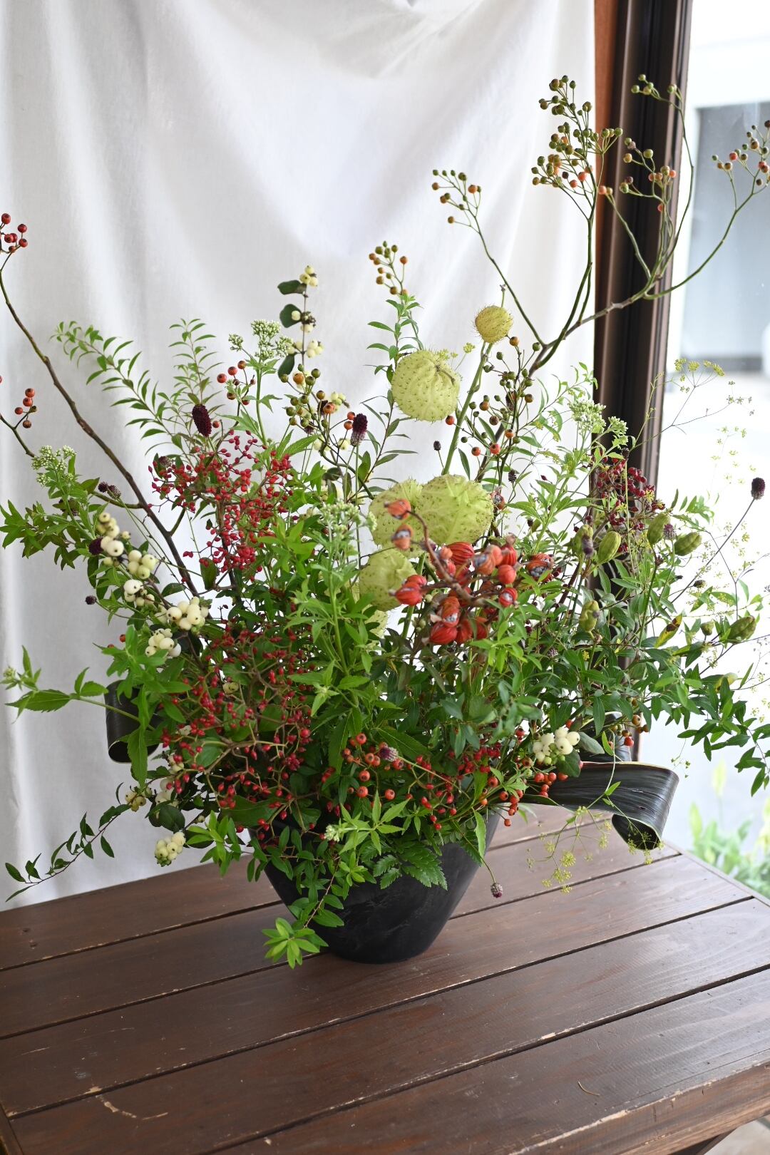 野バラの実や雪柳、ワレモコウにいろいろな実ものを合わせて、ナチュラルな雰囲気に。