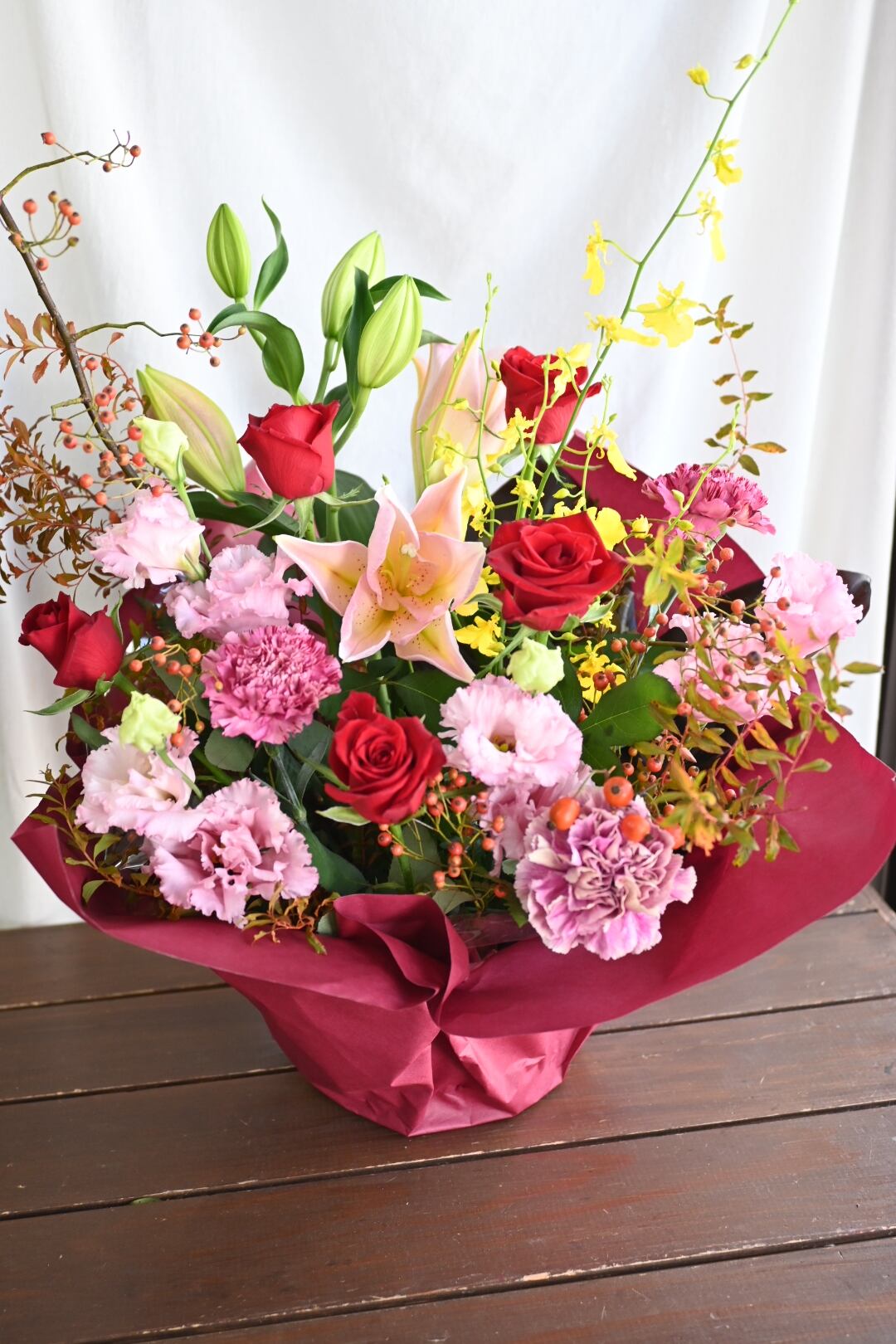 百合やバラ、トルコキキョウやオンシジウムに、秋らしい枝ものや実物を添えて、華やかに仕上げました。