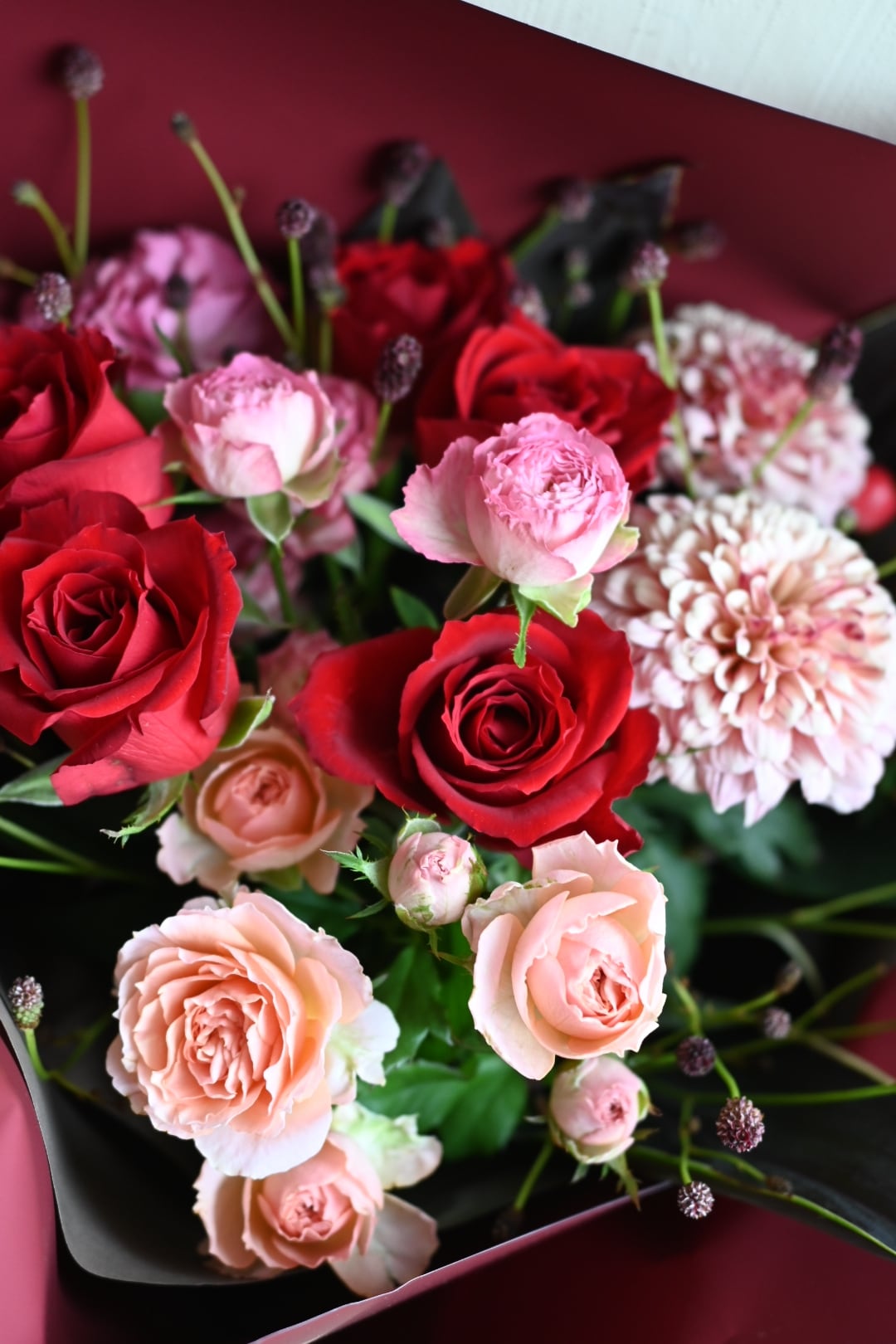 赤系のバラをメインにニュアンスカラーのお花を入れて、シックな雰囲気のあるブーケに仕上げました。