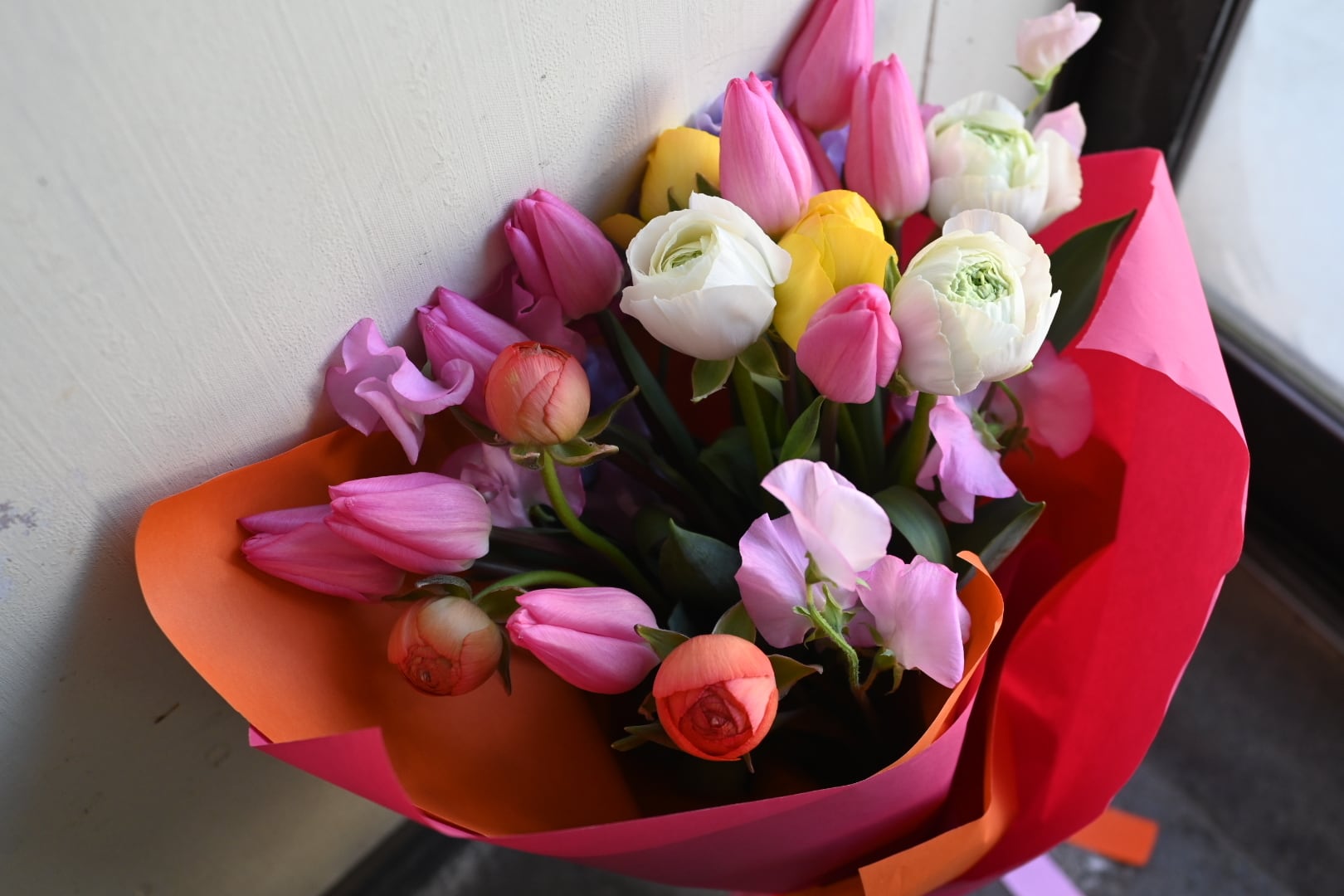 色とりどりのチューリップ、ラナンキュラス、スイトピーをポップな色合いで包んだブーケです。