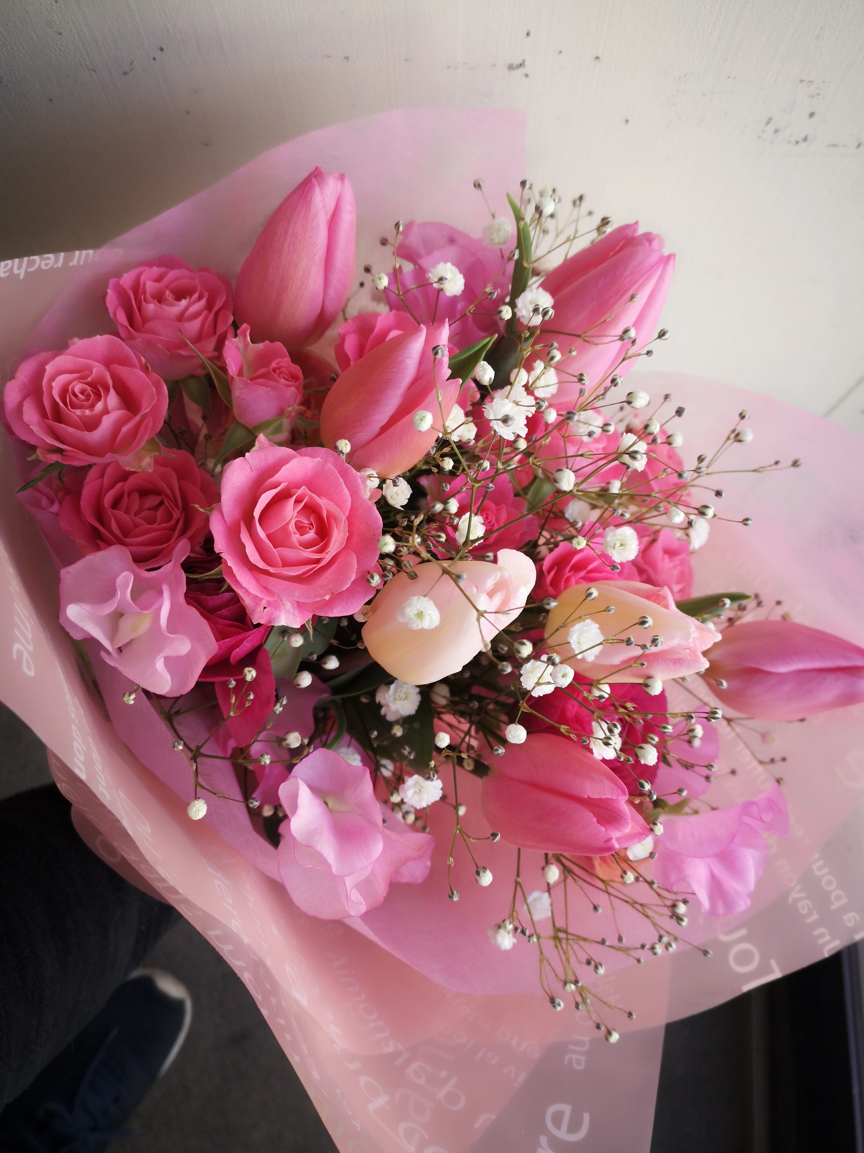 チューリップ、ラナンキュラス、スイトピーなど、春のお花をいろいろお入れします。