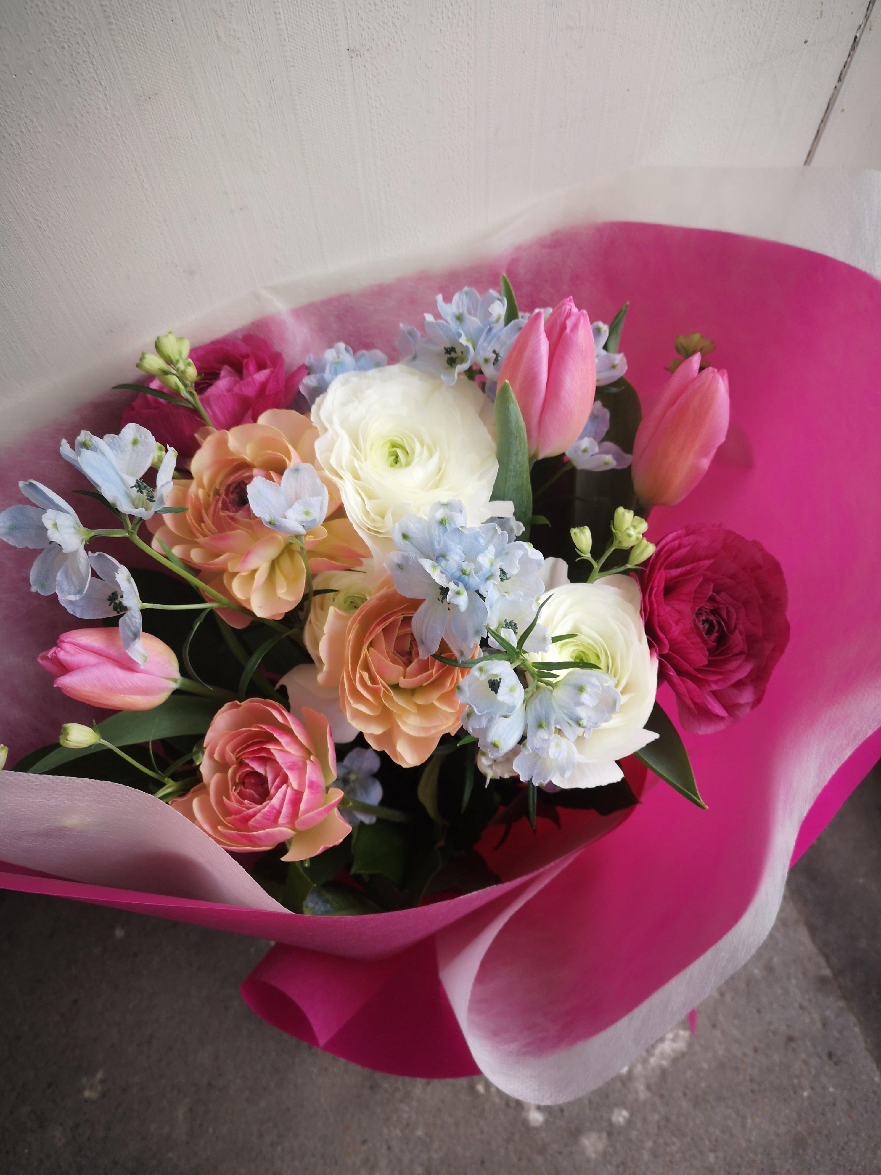 チューリップ、ラナンキュラス、スイトピーなど、春のお花をいろいろお入れします。