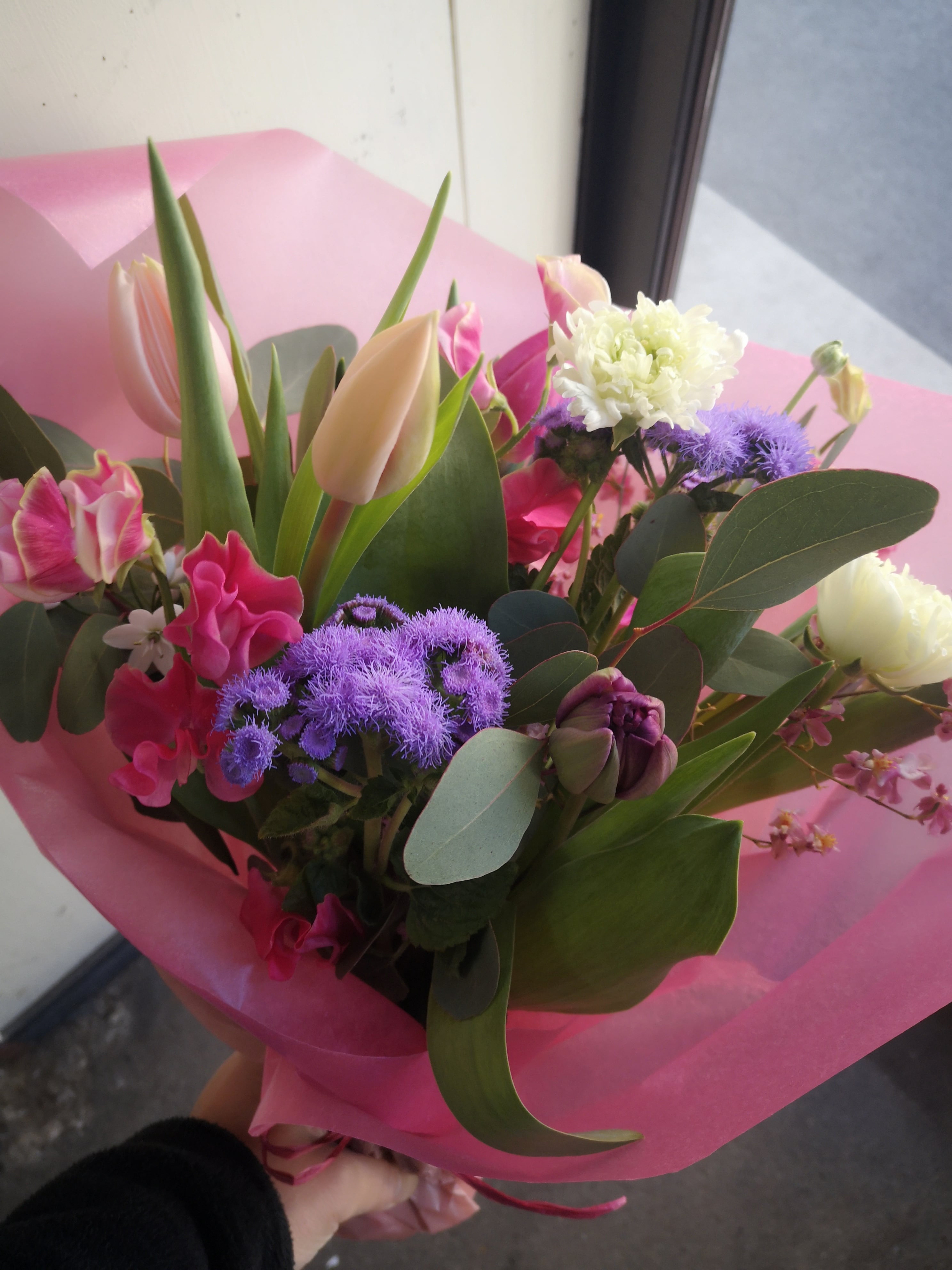 チューリップ、ラナンキュラス、スイトピーなど、春のお花をいろいろお入れします。